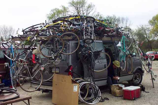 After Memory Lane, we drive up to Ann Arbor Michigan to half indoor/half outdoor swap meet there on Sunday morning. That starts with the getting there early on Sunday morning to seat on line in our vehicles before sunrise, waiting for the gates to open at 7am? From there, we spend all day buying, selling, looking, and smoozing. Last year the van was pretty loaded and people we coming over and taking pictures of our “pile.” Every bicycle, frame, and part in the picture is something we bought while out west last year.