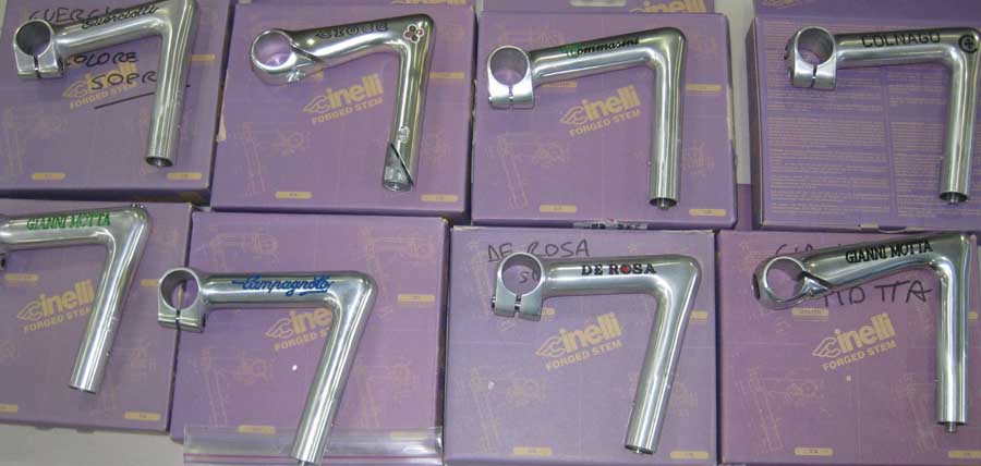 an array of Pantographed Cinelli stems,-Colnago, Merckx, Motta, De Rosa, etc.