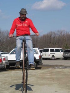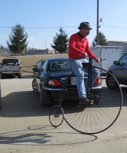 I have been asked many time upon seeing a High Wheeler “how does the rider get up there” and most times the inquiring mind has never seen one in person, let alone someone actually riding one. Without seeing one, you miss the subtle detail of the mounting peg on the lower part of the backbone(frame) of the bike. That mounting peg serves as a the first step in getting atop the bicycle.