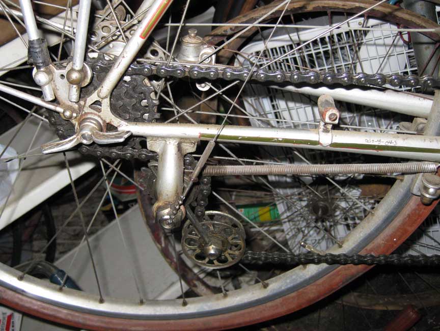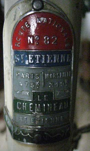 Next is the headbadge to a Le Chemineau. Very cool one that resembles a town landmark milemarker. The bottom picture shows the Chemineau proprietary derailleur system. Also visible is the chainstay protector, Prior super large drilled out hubs, brake unit mounted under the chainstays, and the stays to the Lefol fenders, that actually have a rack built onto to them. I will have more detailed pictures in the future of this 650b bicycle and it’s mate, a 700c model that we got