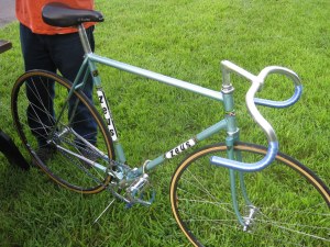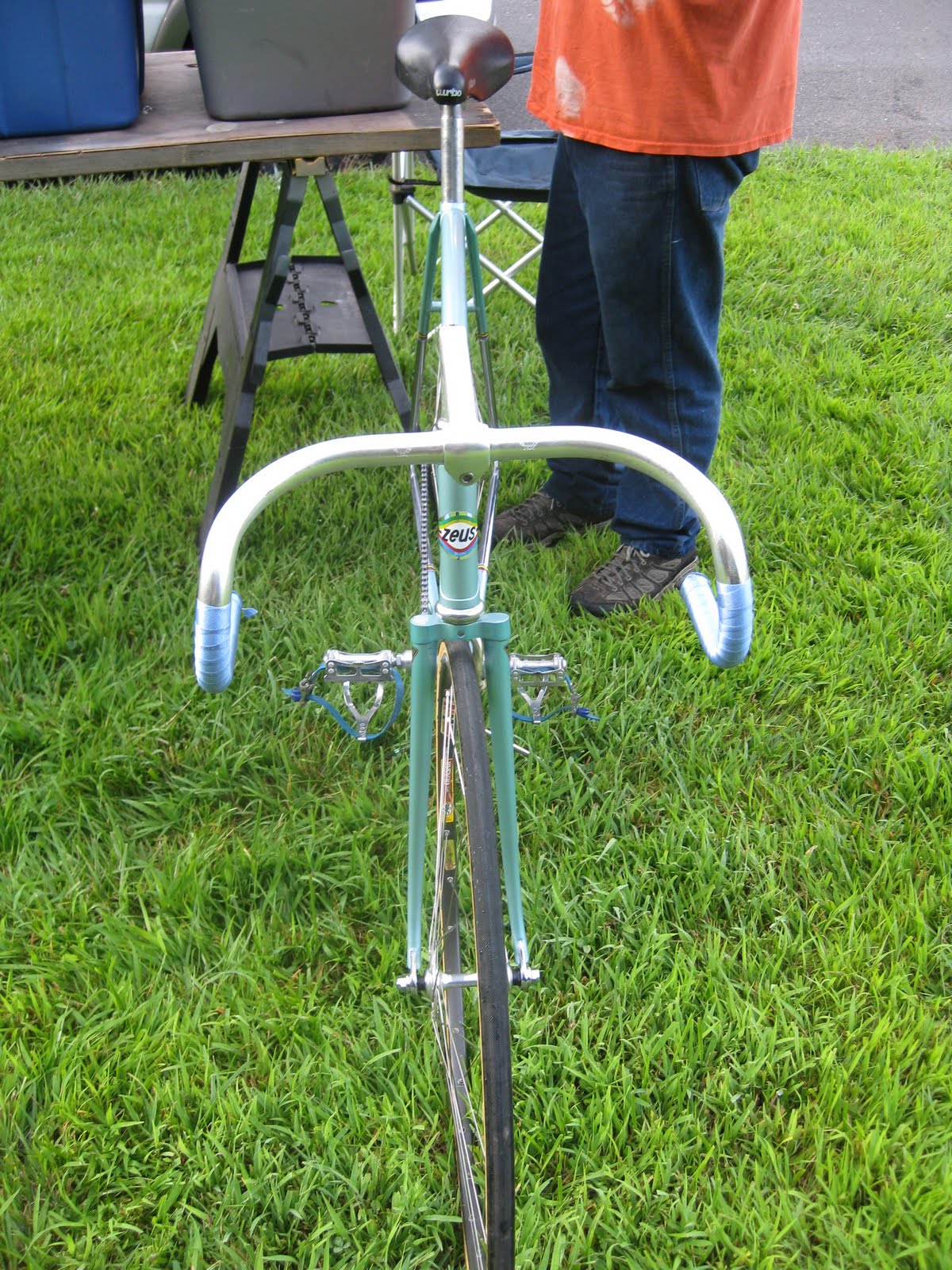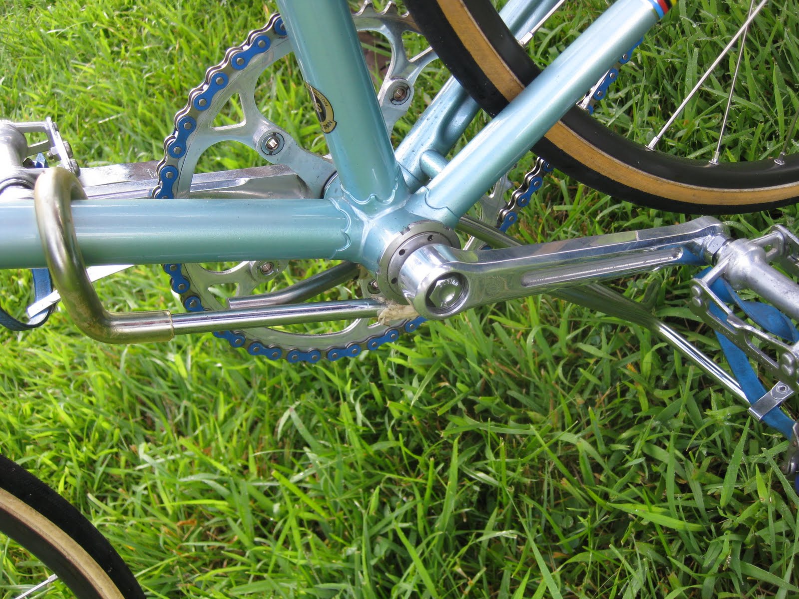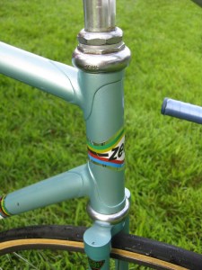 a beautiful Zeus Pista bike. Has Zeus cranks and headset and other bits, it is a very nice example of an early 1970s model. The cranks are obvious copies of first version Campagnolo cranks, as is the headset.