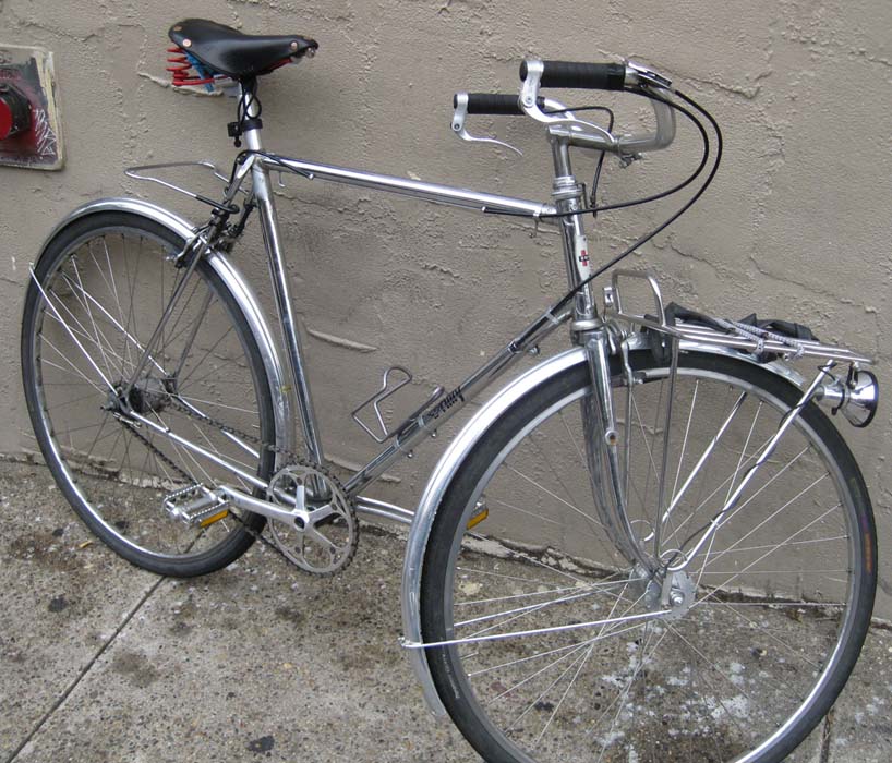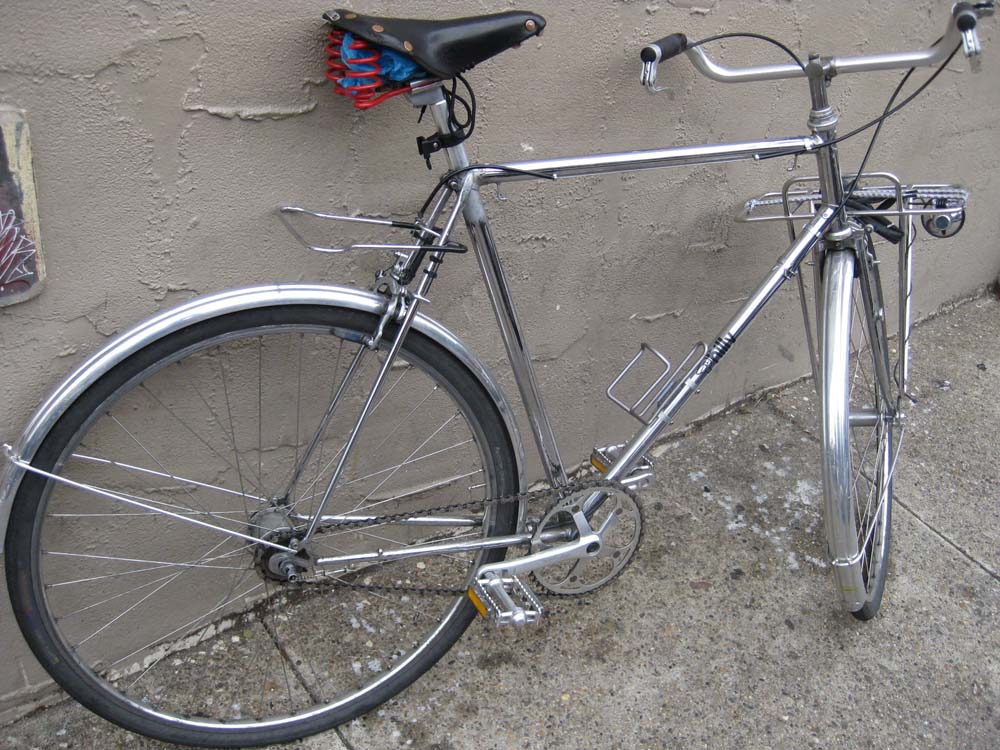 Here is Matthew’s daily city bicycle. Matt has been working at the shop for around 6 years and has an amazing stable of bicycles- including 2 Jack Taylors, Pogliaghi track bike, Schwinn Paramount, and some other bikes that escape me know. This chrome bike is a Carlton built Huffy from the late 1960s. It would have been originally painted a translucent color over the chrome, but that paint never really stuck well on the chrome and we are now left with a nice shiny bicycle.