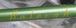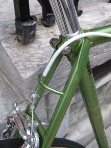 Another awesome customer of ours brought this by the shop because he was looking for some parts for the restoration. It is an early 1970s Raleigh International that was repainted by Circle A Cycles in Rhode Island. The Bronze Green is a hard color to reproduce, like the Cinelli silver. The fork is from an early 1980s Raleigh Team Professional, that actually was used in the 1st US victory of the prestigious Milk Race. Pretty cool.