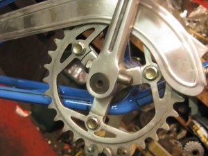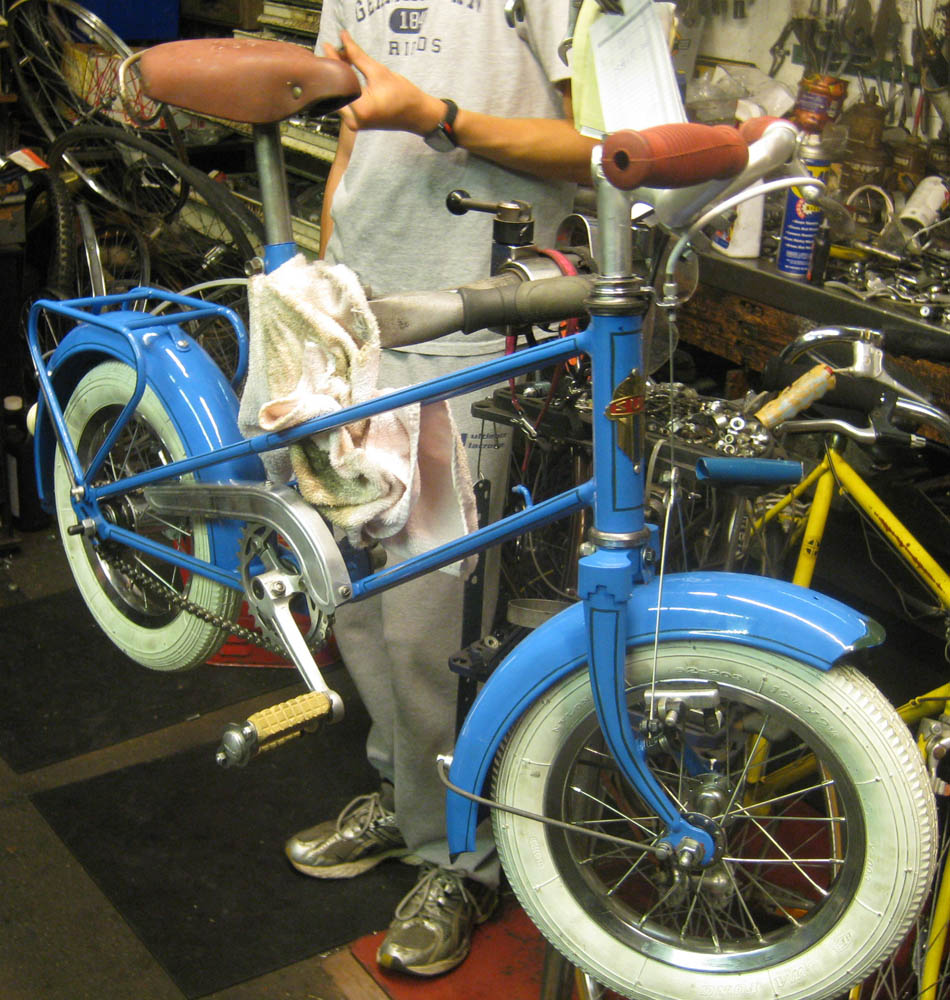 (the complete bicycle was built up with newer wheels, as we could not locate a juvenile threaded track cog and lockring. If you have one, let us know. It is a smaller diameter than normal French threaded diameter, is is somewhere around 30mm for the cog. any ideas???)