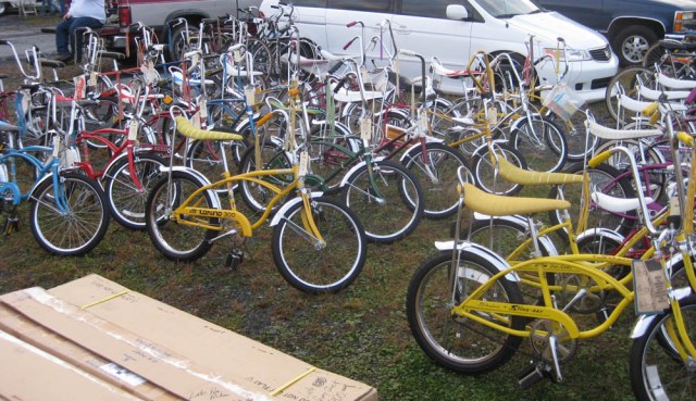 There were lots of interesting bicycles and parts there. This swap meet caters more to the vintage bicycle, compared to the swap meet at the velodrome that is new lightweight stuff. There were piles of Schwinn Stingrays, and balloon tire bikes, and even quite a fair share of turn of the century bicycles with wooden wheels.