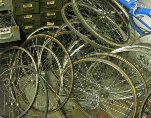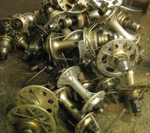 We have tons of tubular tire(glue-on tire) wheels, jokingly I would say we have a ‘wheely‘ lot of them. Most of the are mediocre rims, basic Mavic or Fiamme or Super Champion, and have not much resale value as a complete wheel, the hubs are worth more than what we could sell the wheel for. With space at a premium in this over packed place, I have decided to ‘compress’ some of the piles and the tubular wheels were the first to get the ol‘ heave-ho. So expect some hubs and hubsets for sale in the near future. and if you were looking for any tubular rims, let me know. . .we have them.