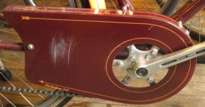 a chainguard mounted on a Bilenky Porteur owned by my friend Pat built by Bilenky Cycles. It is 9th Bilenky he has had built. the Pinstriping was done by Simon Firth at Bilenky Cycles, he is really coming into his own with it. (as you can see, some rubbing. I assume my might end up like this too. well I hope not).