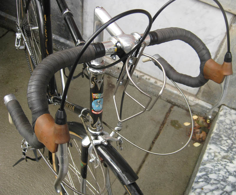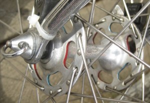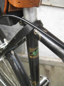 This is a beautiful bicycle owned by a friend of mine and a customer of the shop. It is a mid 1970s Mercian Vincitore. The bicycle is outfitted with a variety of period parts, from Campagnolo Nuovo Record drivetrain, Dia compe brakes, newer Mavic rims. I love the paint applied to the cutouts in the Nuovo Record high flange hubs, it is a very nice subtle touch. I may ‘borrow’ this for one of my bicycles, I forgot how well that accents a bike.