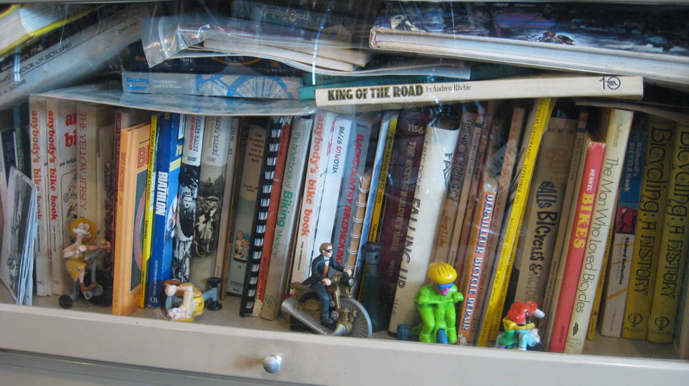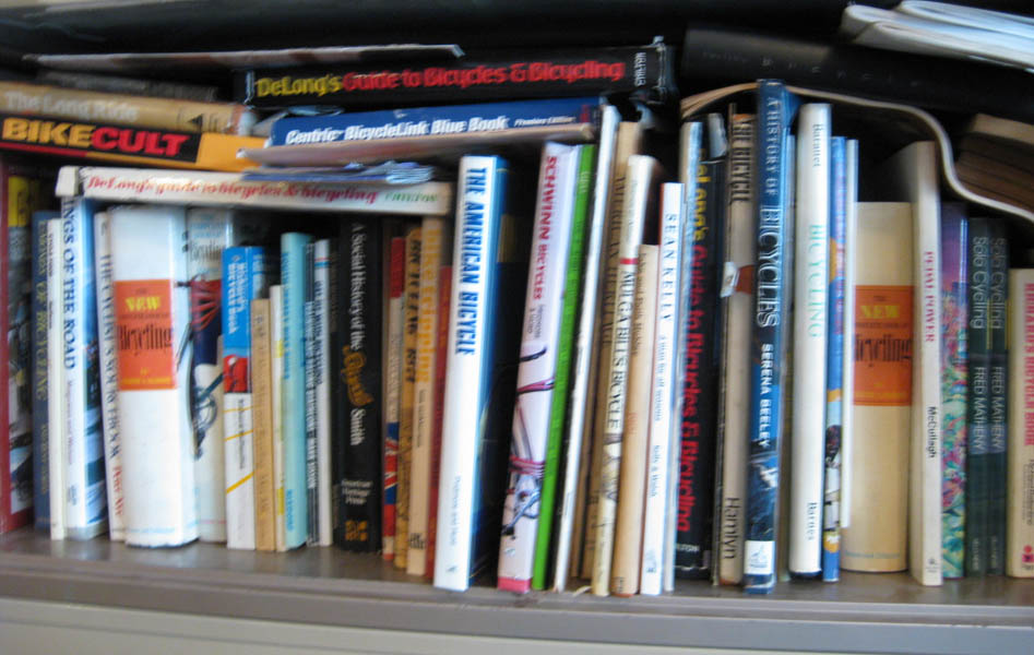 Well rather than a long list of books we have that we want you to have, I took a couple quick blurry pictures. They at least give you an idea of the books we have. and we have tons more. Just send an email of what you are looking for and we can go from there. www.bikeville.com