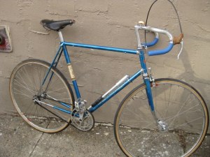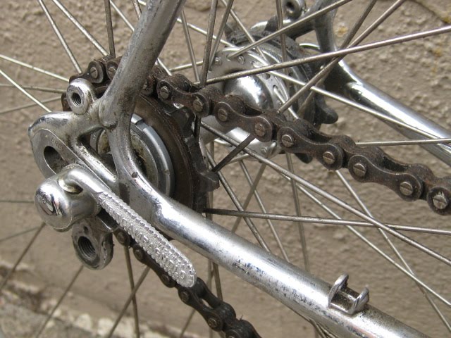 Set up as a fixed gear with Campagnolo inch pitch chainring, 1950s Campagnolo rear hub, and block chain.