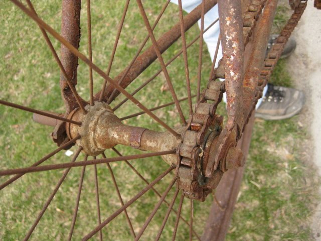 Unique dropout chain tensioner. Some of us who grew up in the 1980s and 1990s will see the extension on the rear axle as a ‘peg’ or ‘pogo,’ something found on BMX bicycles that was originally intended for tricks, but more commonly used to carry your friend around. On this 1890s bicycle, it is a mounting peg, it is used to help assist the rider in mounting and dismounting the bicycle.