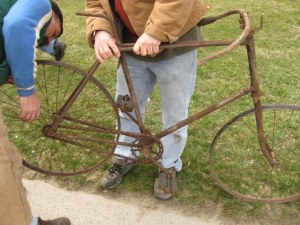 This transition bicycle, introduced after the High Wheeler and before the Pneumatic Safety. The rims were outfitted with a round hard piece of rubber, hence the name Hard Tire Safety. The invention of Dunlop’s pneumatic tires(air filled tires) made the Safety the clear winner in bicycle design over the High wheeler. The pneumatic tires provided the cushy supple ride of the High Wheeler with the safety of . . .you guessed it, a safety.