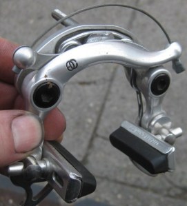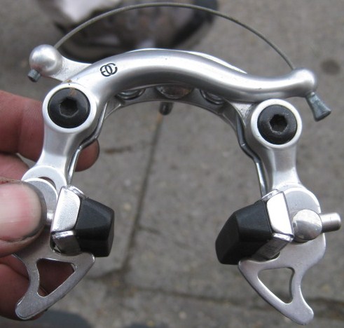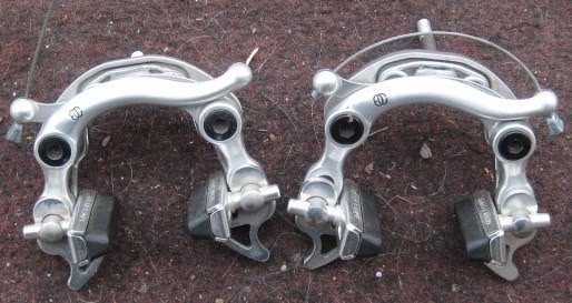 these are the most gorgeous center pull brakes. well sculpted and in a buffed finish took center pull brakes to the next level, even though they were considered passe when they were introduced in 1986. They were developed by a RISD grad, and partially based off the Mafac Competition, even using a similar straddle wire.