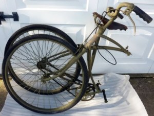 A customer brought in a wartime BSA Paratrooper bicycle. The bicycle folds in half and was used in service by British paratroopers, during WWII.