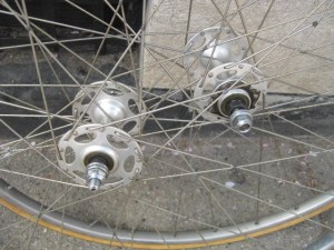 the wheels are mismatched. the rear is 28 spoke and the front is 36 hole. Tubular rims.