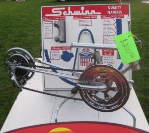 (the Schwinn gear demonstrator in the photo above was a 1970s one, with the large Schwinn stem shifters. The price tag of $250 is ambitious, as I usually see these selling for $100 or less. Behind it is a display showing the all the merits of the construction of a Schwinn bicycle, messing a couple bits.)