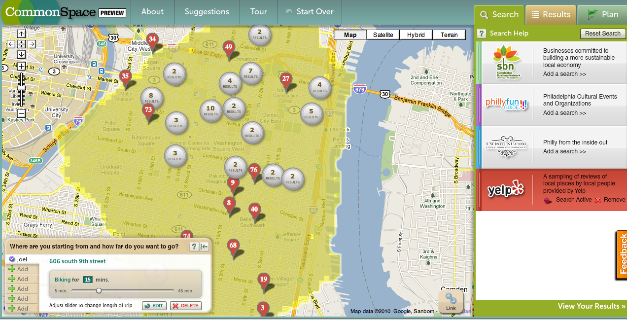 CommonSpace personalizes an adventure on the town by enabling you to discover places you can reach by walking, biking, or public transit, add destination to an interactive map, and share it with others. Search attractions in dining, drinks and the arts. It utilizes Google Maps and then sites like Yelp or Sustainable Business Network to find cool things for you to do.