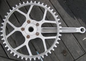 This French aluminum cottered crank arm was manufactured after WWII in the late 1940s. Stronglight had already been manufacturing aluminum cotterless cranks for over a decade, so it seems a little strange that manufacturers didn’t all move toward using square taper crankarms over cottered. All that said, TA did introduce their Criterium crankset that employed a cotterpin-like system on a pear shaped spindle around 1961, well after Campagnolo had started producing their iconic Record crankset using a square tapered spindle.