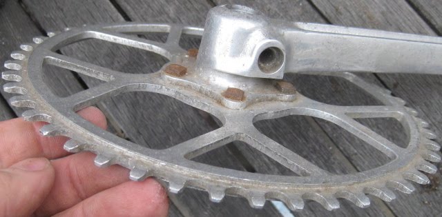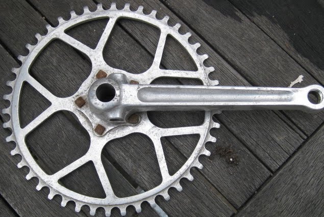 This French aluminum cottered crank arm was manufactured after WWII in the late 1940s. Stronglight had already been manufacturing aluminum cotterless cranks for over a decade, so it seems a little strange that manufacturers didn’t all move toward using square taper crankarms over cottered. All that said, TA did introduce their Criterium crankset that employed a cotterpin-like system on a pear shaped spindle around 1961, well after Campagnolo had started producing their iconic Record crankset using a square tapered spindle.