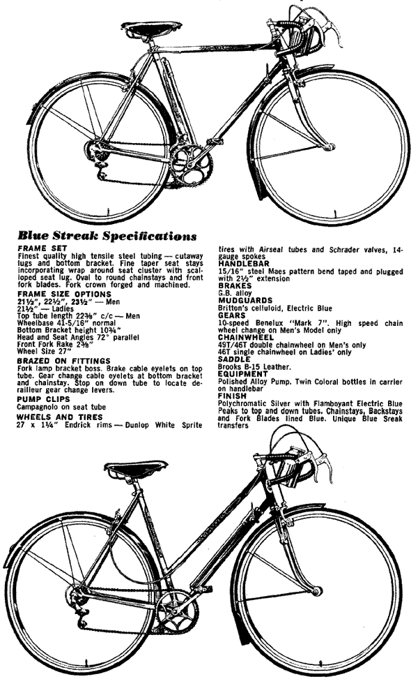 “ “In 1960 Raleigh brought out the five or ten-speed Blue Streak to push sales in the teenage sports enthusiast sector. Complete with twin bar mounted bottles it certainly was popular!”