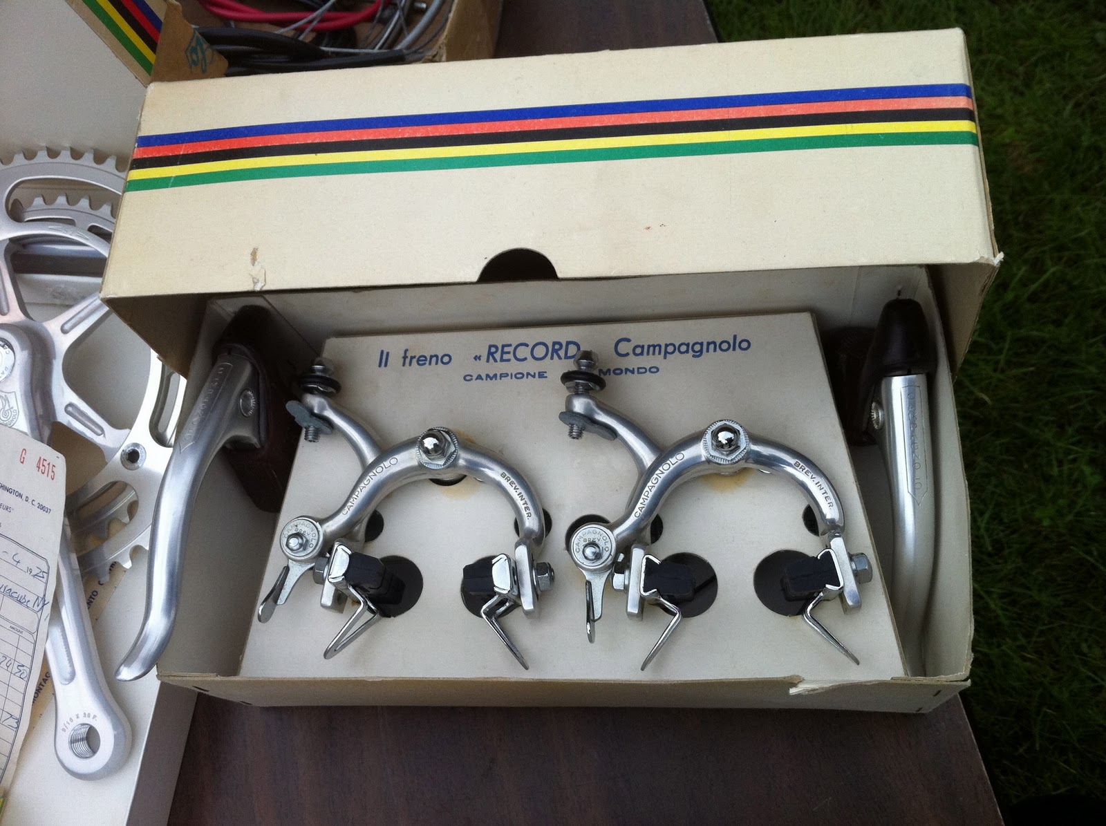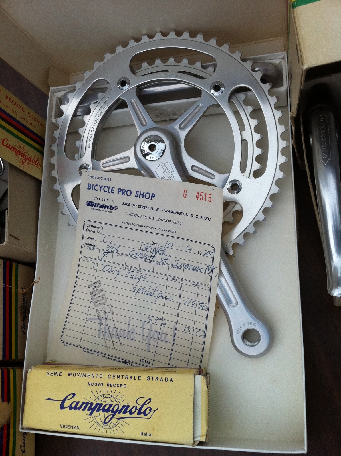 A seller at the Trexlertown swap meet was displaying this 1975 Campagnolo Nuovo Record group. It was not for sale, per se, but for the right amount of money, anything is for sale at a bicycle swap meet. It was cool with the original receipt and all. Share this: Click to share on Facebook (Opens in new window) Facebook Click to share on X (Opens in new window) X Click to email a link to a friend (Opens in new window) Email Like Loading...