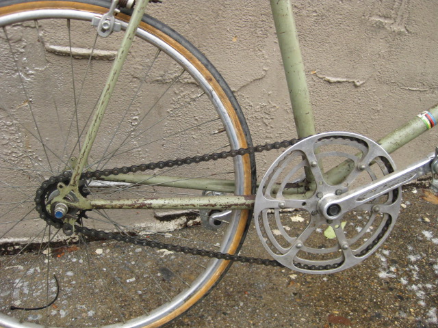 Here is a wacky little bike we have owned since the early 1980s. It is a bike polo bike built by Mark Mattei(owner of Cycle Smithy in Chicago). It is based on the Grubb bike polo frame design and has 24″ tubular fixed gear wheels. TA cranks that look like they were originally taken off a Schwinn Super Sport from the early 1970s, Campagnolo Nuovo Record seatpost with plastic french saddle. The handlebars were added later and were originally from a 1940s/50s Italian city bike, like Frejus or Bianchi.