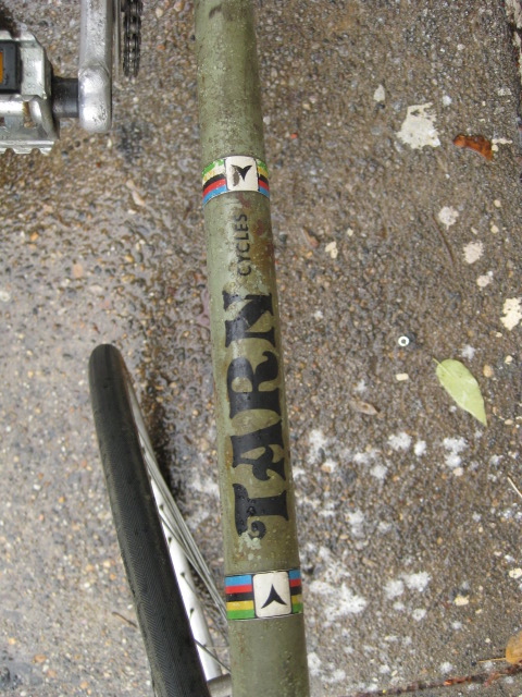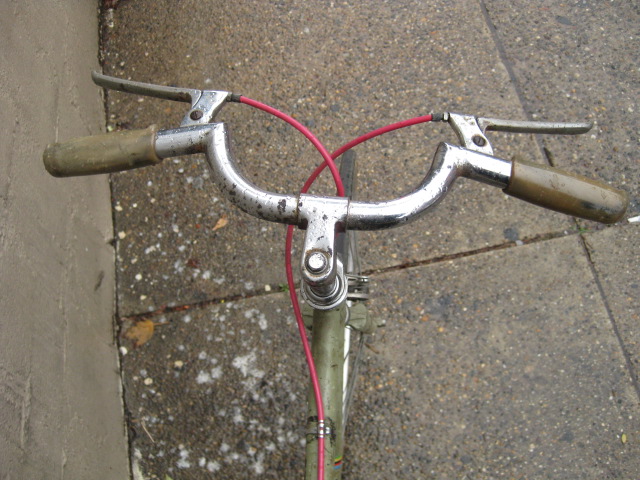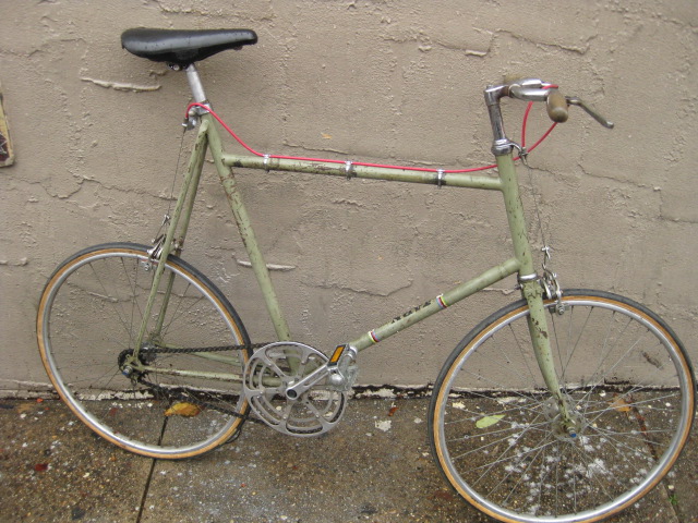 Here is a wacky little bike we have owned since the early 1980s. It is a bike polo bike built by Mark Mattei(owner of Cycle Smithy in Chicago). It is based on the Grubb bike polo frame design and has 24″ tubular fixed gear wheels. TA cranks that look like they were originally taken off a Schwinn Super Sport from the early 1970s, Campagnolo Nuovo Record seatpost with plastic french saddle. The handlebars were added later and were originally from a 1940s/50s Italian city bike, like Frejus or Bianchi.