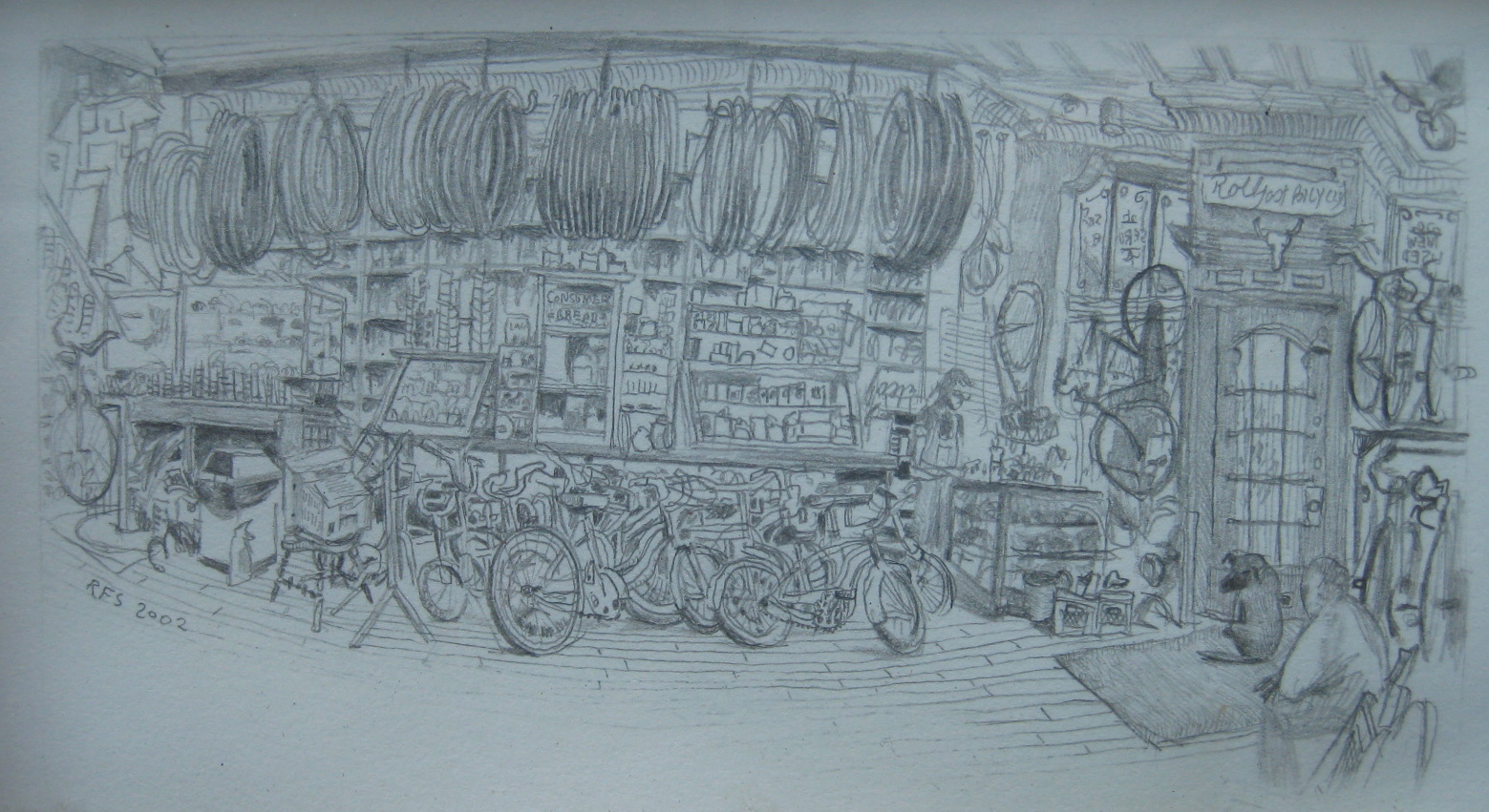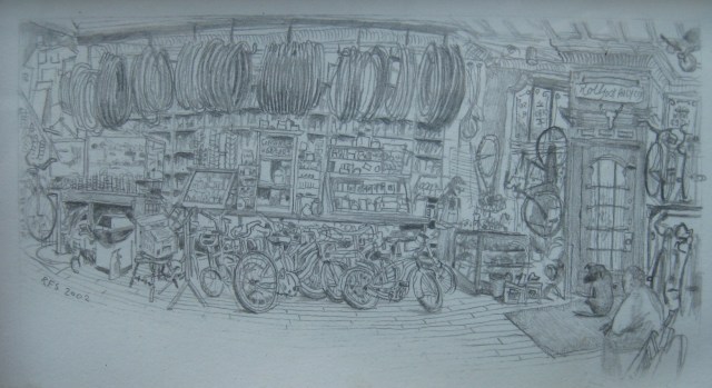 This pencil drawing was done by our friend Randall Sellers in 2002. His work is on the small side, I think this drawing is 3″x4.5″. It was drawn when the shop was set up opposite what it is now- the shelves and countertop is now on the left when you come in the door, not the right. Oh, we also have a new Fido.