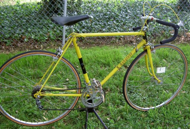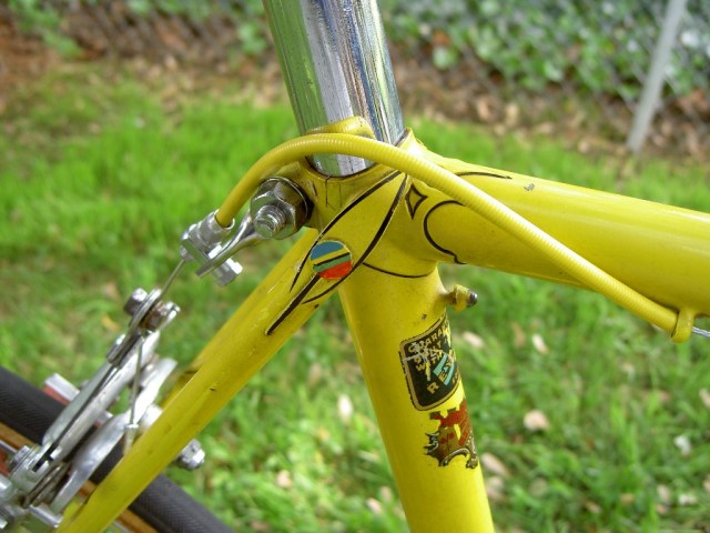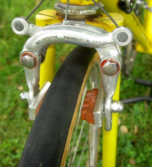 This bicycle is outfitted with all the high end equipment available at the time. First generation Campagnolo alloy cotterless Cranks and Gran Sport derailleurs. Early Weinmann engraved centerpull brakes, GB spearpoint stem. Campagnolo Gran Sport high flange quick release hubs. Unica saddle with integrated Nitor seat post. Unrestored condition. Winner of 2005 Best Unrestored British bike at Cirque du Cyclisme. We have owned this bike for at least a decade now, and this is one of my favorite bikes the shop has in it’s collection.
