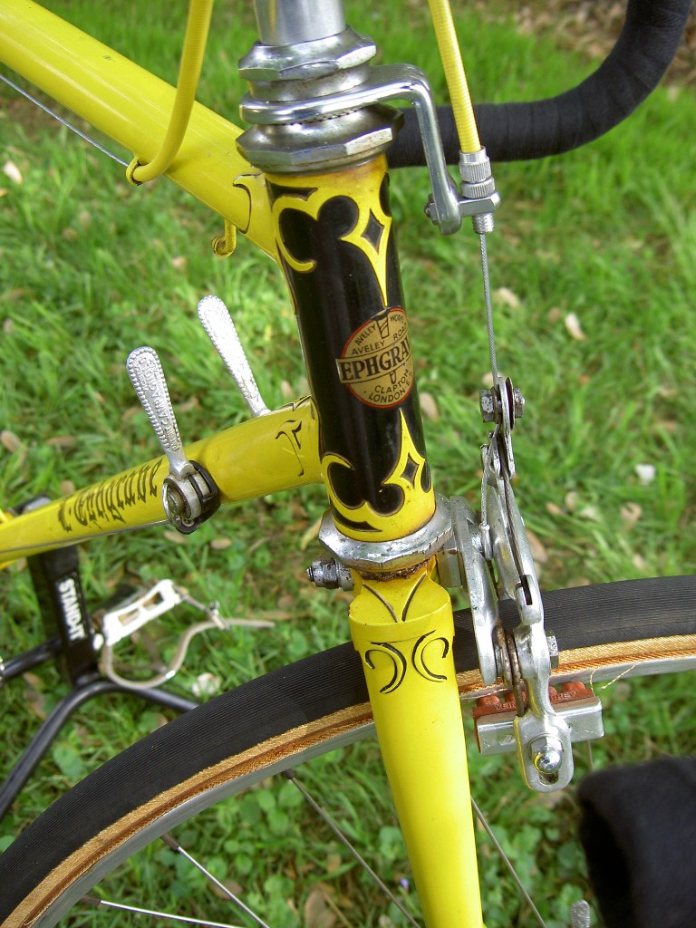 Late 1950s Ephgrave Super No.1 bicycle. Les Ephgrave was a London, England from builder starting at Harry Rensch of Paris Cycles just before WWII and then moved onto Claud Butler before starting to build under his own name. The Super No.1 was the top end model that he built and is known for it’s embellished lugwork with windows cut out and the lollipop that he added to the top eyes(seat stay caps).