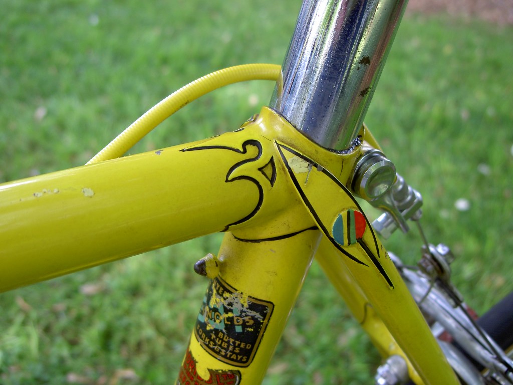 This bicycle is outfitted with all the high end equipment available at the time. First generation Campagnolo alloy cotterless Cranks and Gran Sport derailleurs. Early Weinmann engraved centerpull brakes, GB spearpoint stem. Campagnolo Gran Sport high flange quick release hubs. Unica saddle with integrated Nitor seat post. Unrestored condition. Winner of 2005 Best Unrestored British bike at Cirque du Cyclisme. We have owned this bike for at least a decade now, and this is one of my favorite bikes the shop has in it’s collection.