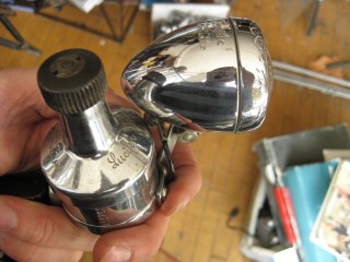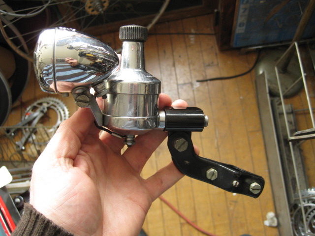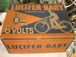 New in original box, Lucifer front light/generator combo set. What a great looking box and equally great looking light. Mounts to the fork and is a self contained unit, no need to fumble with wires. Made in Switzerland. Lucifer lights were commonly outfitted on British bikes, including a couple Jack Taylors we have and I have seen it on a Hurlow as well.