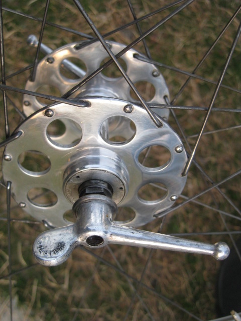Large flange Chater Lea Hubs with GB aluminum wingnuts. The axles were fitted with a grease fitting.