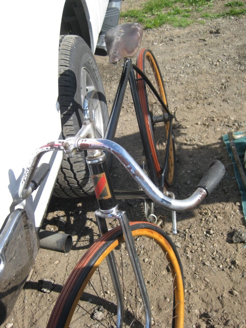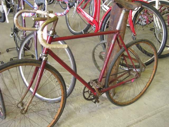 Elgin Racer track bike. Wooden Lobdell wheels, beautiful two-tone Penn Racer tires, Troxel leather saddle. estimated 1931 date.