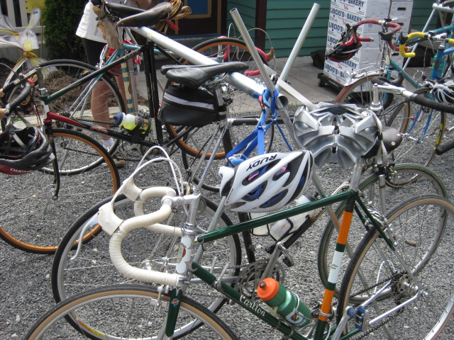 A rack of bicycles at the lunch stop. The Hill Cycle I rode, a beautiful wood rim restored Umberto Dei track bike, a fixed gear converted Scapin, and a mid to late 1960s Carlton.