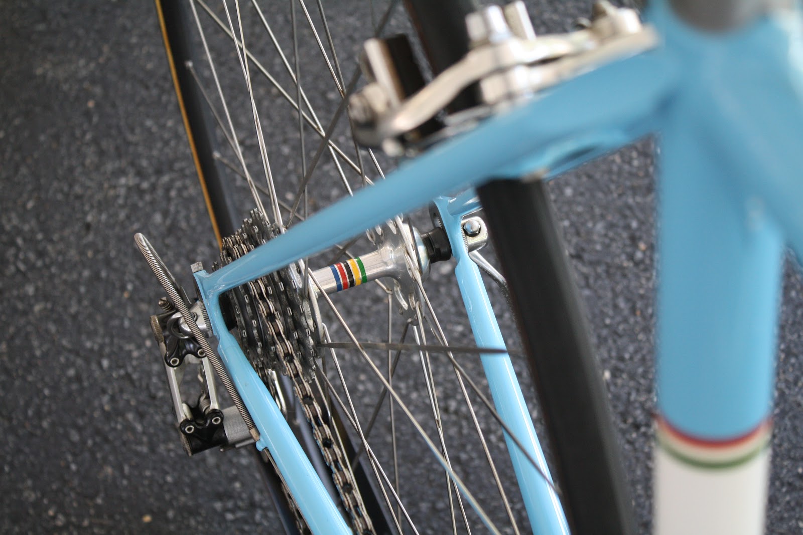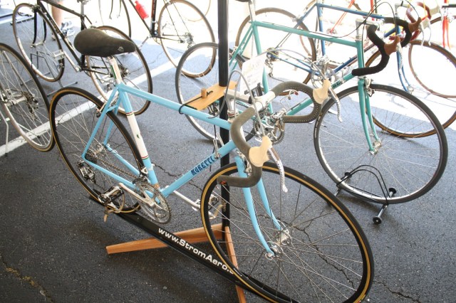 Named after Caesar Moretti- a six day bike racer from the 1930s-1950s, some were imported Bertins and others were supposedly built in Italy. This light blue bike was built by Eric Parker.