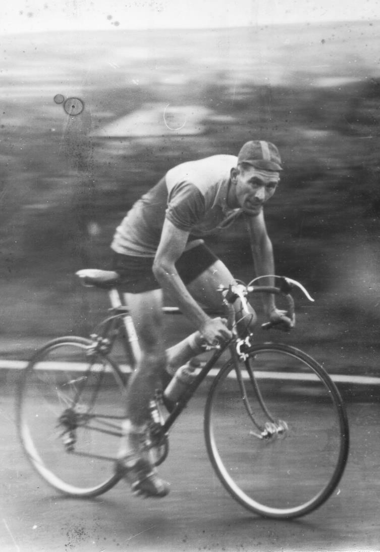 True racing bike, not even a brazeon for a light bracket on the fork, which was ubiquitous at this time on British bikes. Spare tubular tire wrapped around his shoulders, the race must have been unsupported(riders had to fix their own bikes back then), unheard of now days.