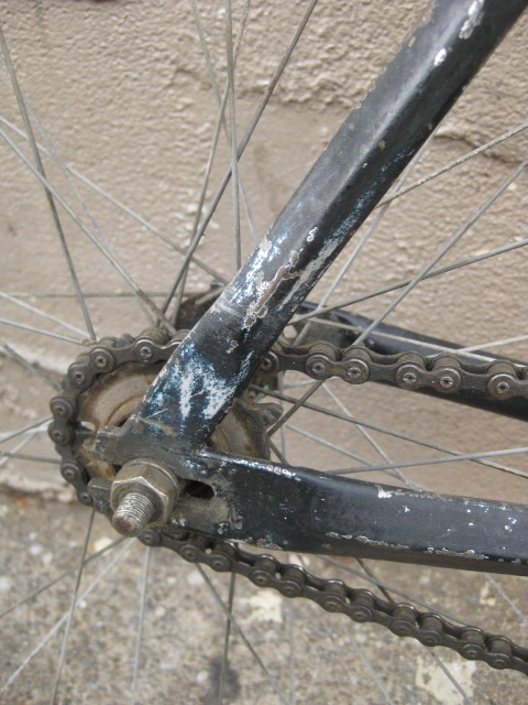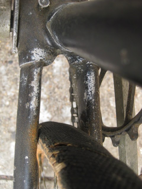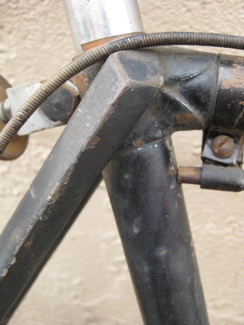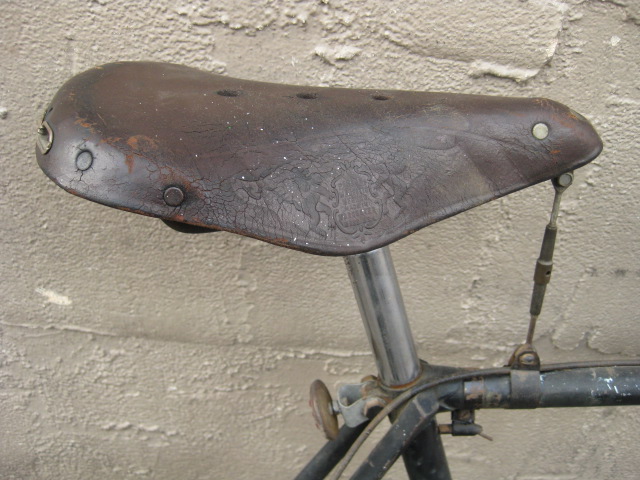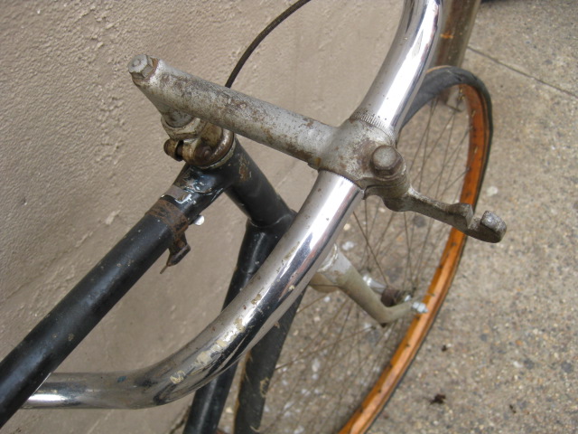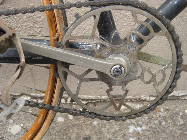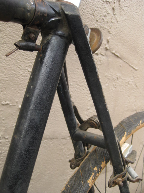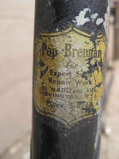 Unknown builder with incorrect fork. It does have Pop Brennan decal on the headtube, but we do not believe it was built by him. It may have been worked on or repaired by him. The lugs are finely filed, rather uncommon from this time period. The rear triangle is built with diamond seat and chain stays, I have never seen a bike with this treatment. Unique CCM steel cotter-less cranks, wood wheels, and early Persons saddle. Any help in identifying????