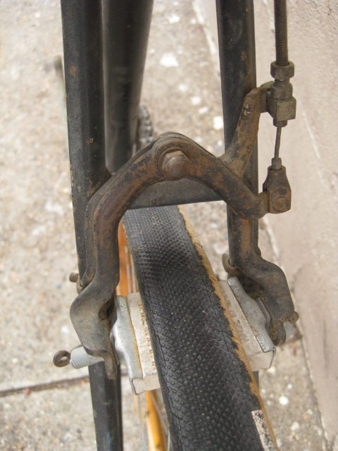 A brake as an afterthought. It clamps on the seatstays, and does not require the brake bridge to be drilled.
