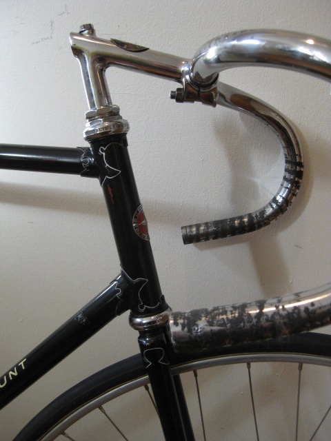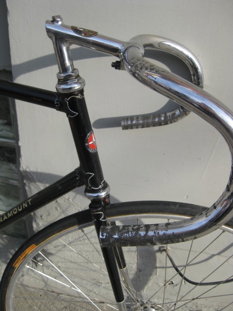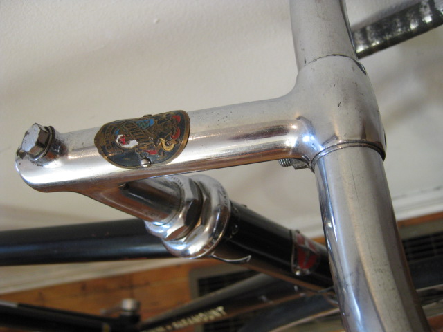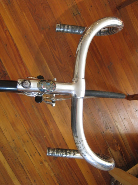 Cinelli badged track stem and Cinelli chrome steel track handlebars #18. (the stembadge screws are not original, but brass reproductions)