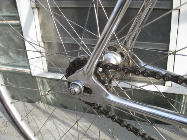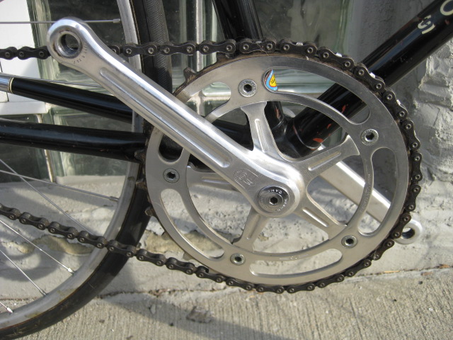 Campagnolo Pista cranks with inch pitch chainring, and campagnolo inch pitch cog.