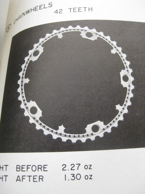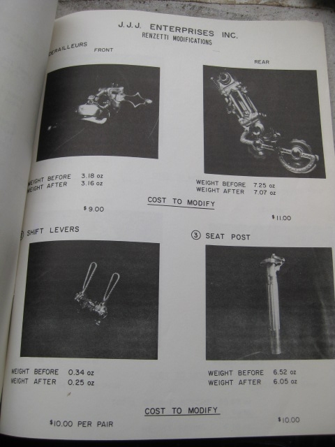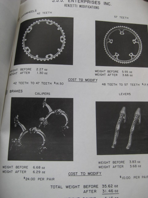 With a rebirth, or one artisan calls a revival, in the process of lightening bicycle components, I recently unearthed this catalog from the 1970s showing some of the results in the Renzetti modifications on Campagnolo parts. Some of the weight differences(before and after the process) seem to be negligible, it appears to be more aesthetics. I guess in the end, all the combined weight savings does add up, and make for a pretty effect. The costs(in 1970s dollars) of saving 4ozs(1/4 of a pound) would have been $96, that’s $470 in today’s dollars! That is the weight of a cheeseburger, one expensive cheeseburger. See our Hill Cycle bicycle with lots of drillium and milling. Also check out Drillium Revival, they do awesome work.