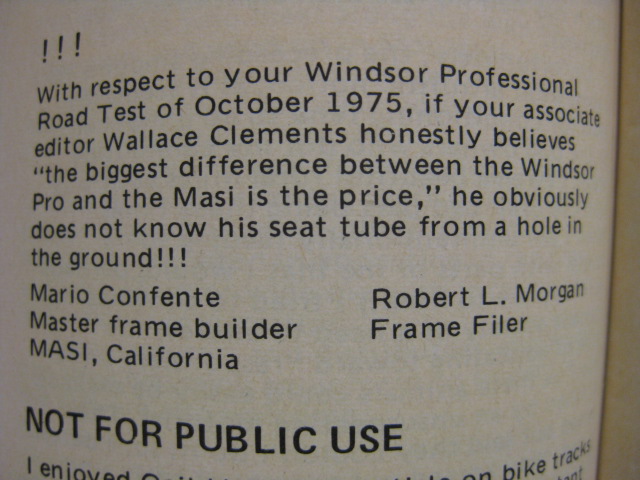 Bicycling Magazine 1976 Mario Confente’s opinion about a statement Bicycling Magazine’s editor Wallace Clements made in 1975. Share this: Click to share on Facebook (Opens in new window) Facebook Click to share on X (Opens in new window) X Click to email a link to a friend (Opens in new window) Email Like Loading...