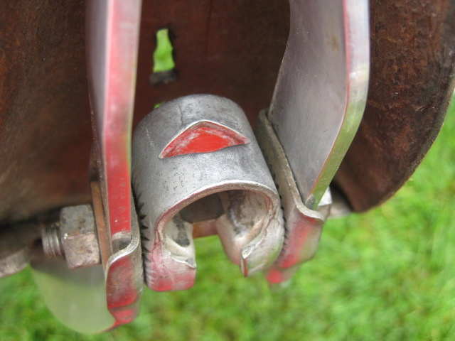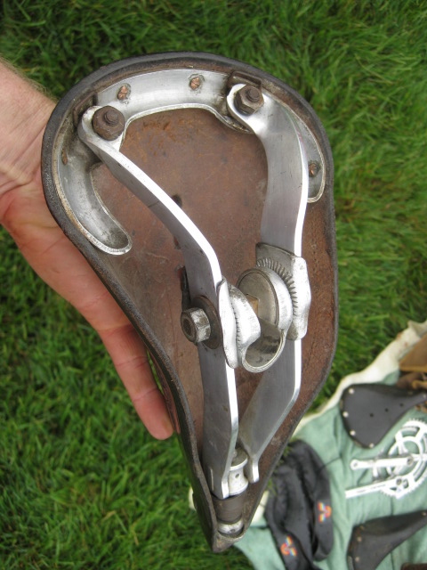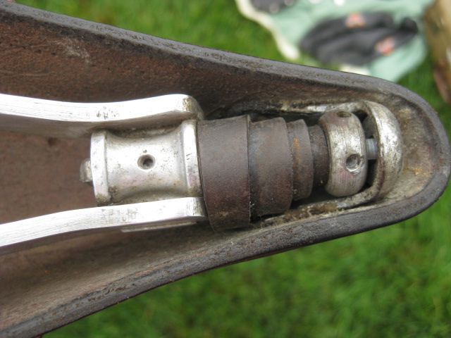 This unusual coil spring is mounted in between the aluminum nose piece and the rail mount. A pin tool would be inserted to adjust the tension of the saddle, I guess the spring was included to keep the tension between the front end of the leather saddle in proper tension with the saddle rails?? It is also worth noting the amount of aluminum parts involved in the production of this saddle. On a similar Ideale aluminum rail saddle, only the rails and seat clamp are aluminum, all the other parts are steel. Most of the parts on this Pearl saddle are aluminum, minus the spring, bag loops, bolts/nuts and the aforementioned copper rivets.