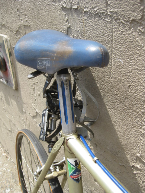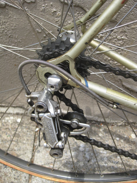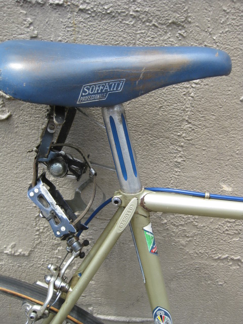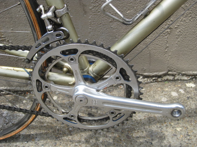 Chainstays are shaped tubing- diamond, rather than round. Heart cutout of the bottom bracket shell underneath.Campagnolo dropouts with provision to accept Campagnolo Portacatena on the drive side- so that dates the frame late 1970s, early 1980s.