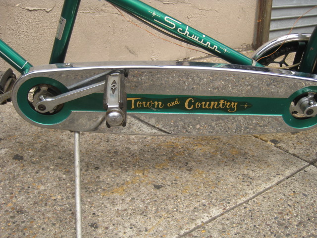 Beautiful original Schwinn Town and Country tandem. Early 1960s- the Sturmey Archer 3 Speed hub is dated 1960. Original paint, bow pedals, Schwinn speedometer, baby seat . . .the whole 9 yards! Chrome is beautiful. It is the same design and look as the 1940s-1950s Schwinn Town and Country tandems, last of that generation. Time capsule piece.