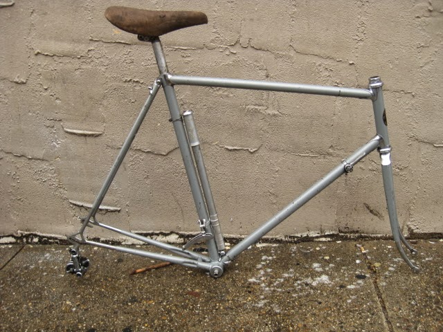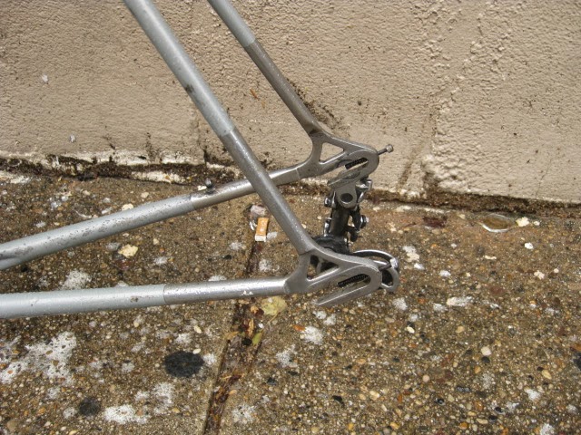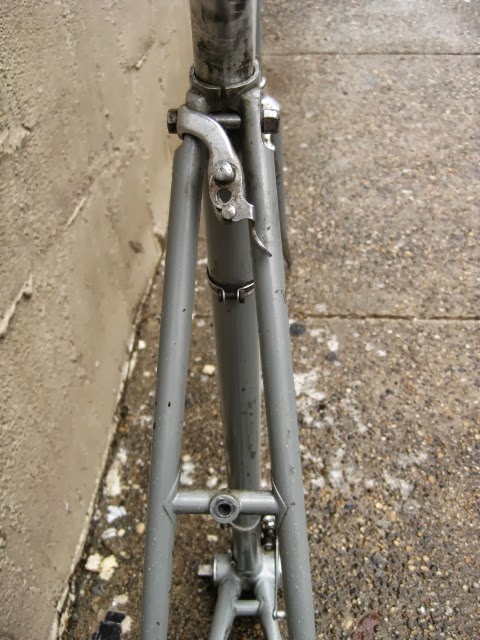 earlier seatbolt with rare hanger for universal centerpull brakes. Campagnolo Record rear derailleur has replacement jockey wheels.