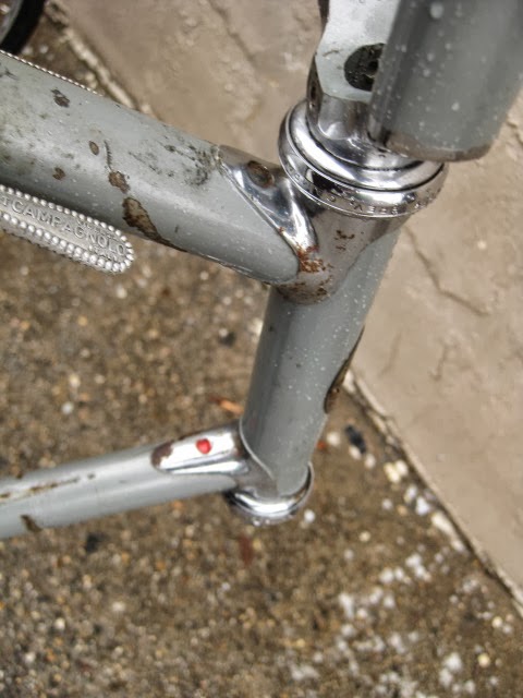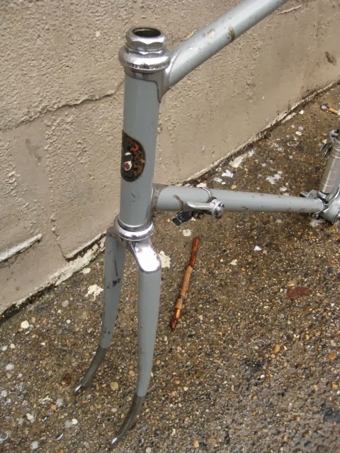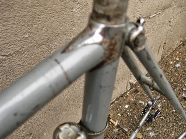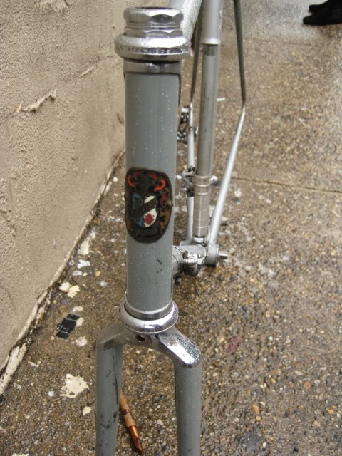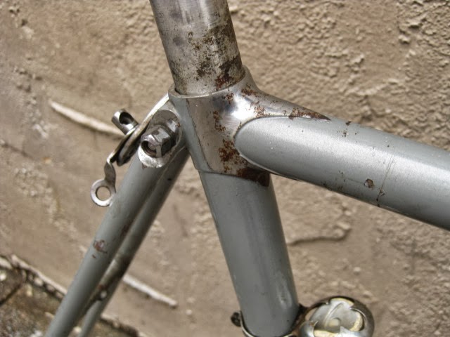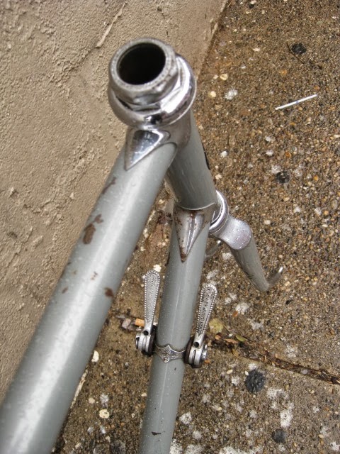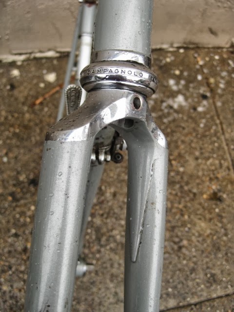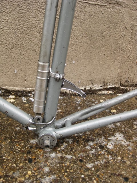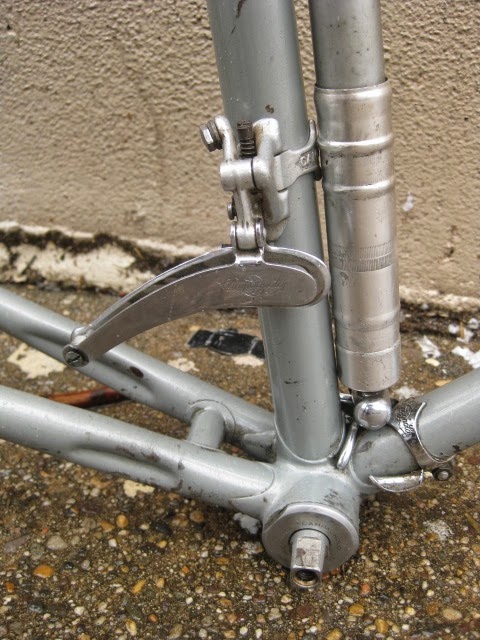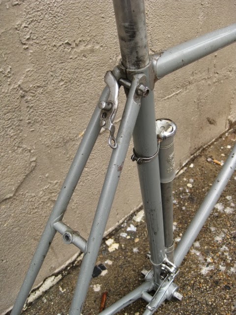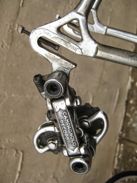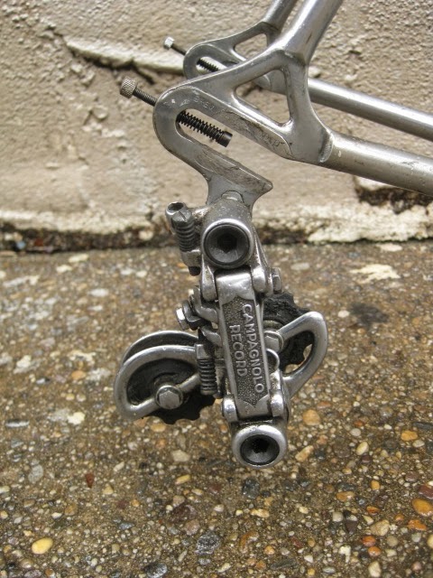 earlier seatbolt with rare hanger for universal centerpull brakes. Campagnolo Record rear derailleur has replacement jockey wheels.