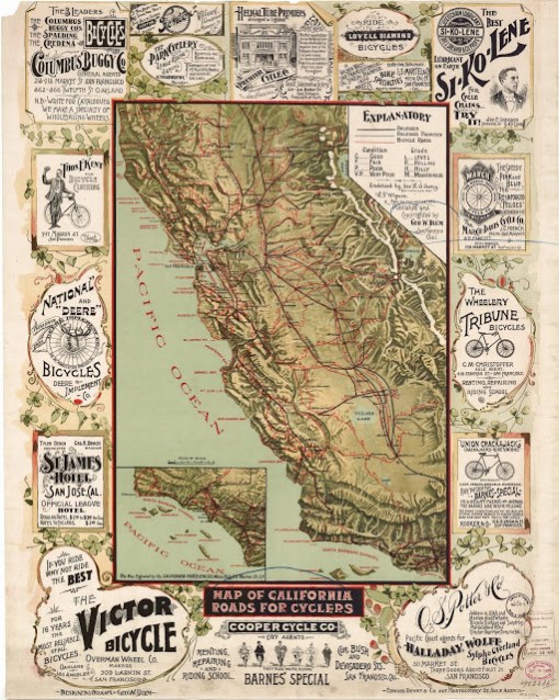1896 Cycler’s Guide and Road Book of California. It has great advertisements, and I can only imagine what the roads labelled ‘poor’ condition were like, as even the best roads at that time were not paved. The roads of the late 19th Century were gravel or dirt roads.