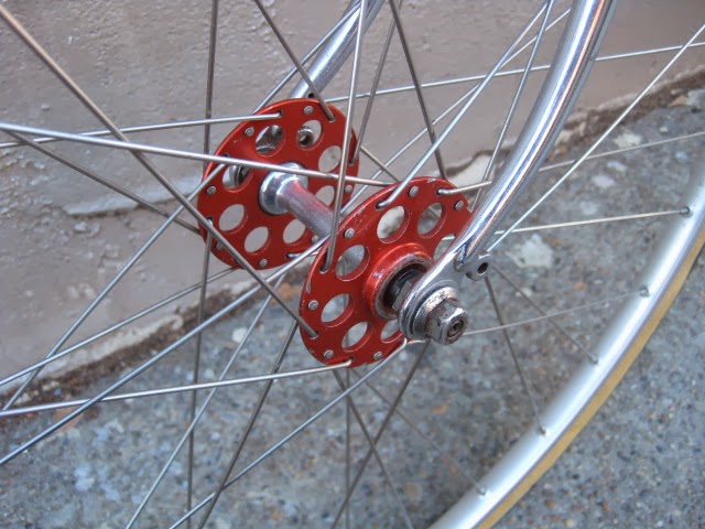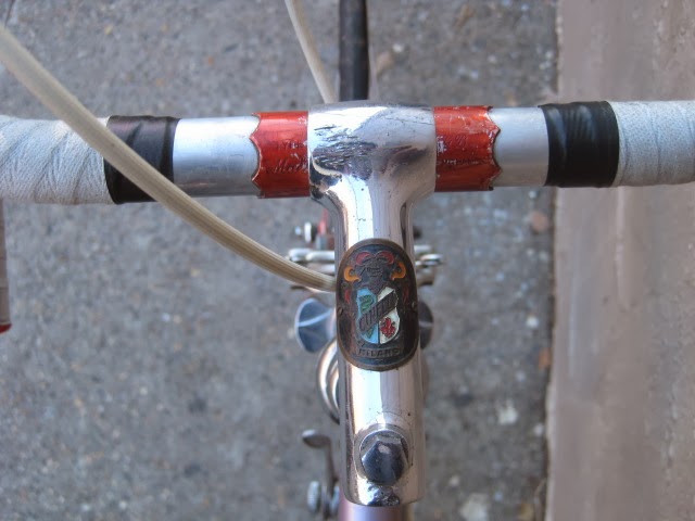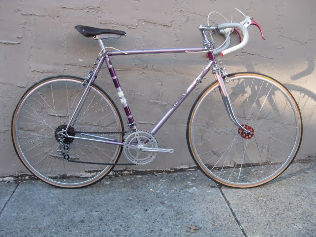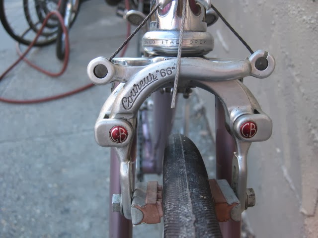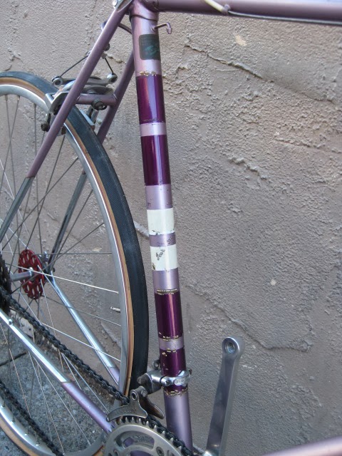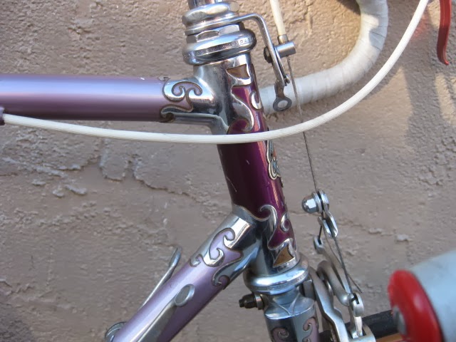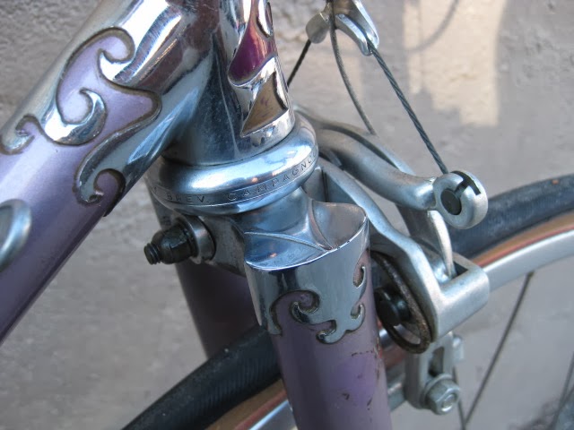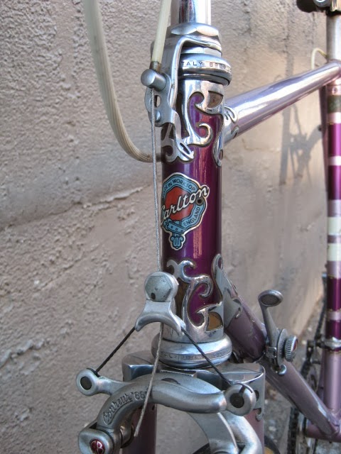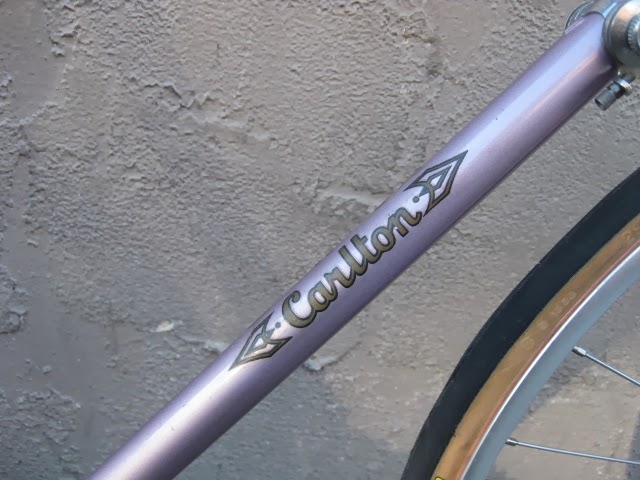 This is one of my favorites. It is an early 1960’s Carlton. There are a couple reasons why I like this bike. First of course is the international lug set. Extremely ornate and well filed / thinned. The seat cluster with the ornate wrap over seat stays are quite elegant. The paint scheme is really sharp and the decals are the nicest I have ever seen from Carlton (in my opinion). The fork crown echoes the ornate lugs nicely. Borrowing a bit from Hetchins treatment perhaps but still all their own.The only thing that’s missing is an arching rear brake bridge. I would not call the stays “pencil” but they are nice and thin.